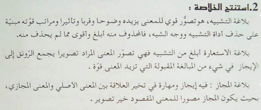 استنتج الخلاصة: بلاغة التشبيه تتمثل في القدرة على تصور المعنى بوضوح وجعله أكثر قرباً وتأثيراً. تزيد قوة التشبيه بحذف أداة التشبيه ووجه الشبه، حيث يكون التشبيه المحذوف أبلغ وأقوى. أما بلاغة الاستعارة، فهي أبلغ من التشبيه لأنها تصوّر المعنى المراد بصورة تجمع بين الجمال والإيجاز مع لمسة من المبالغة المقبولة التي تعزز من قوة المعنى. وأخيراً، بلاغة المجاز تتميز بالإيجاز والمهارة في اختيار العلاقة بين المعنى الأصلي والمعنى المجازي، بحيث يصوّر المجاز المعنى المقصود بأفضل تصوير.